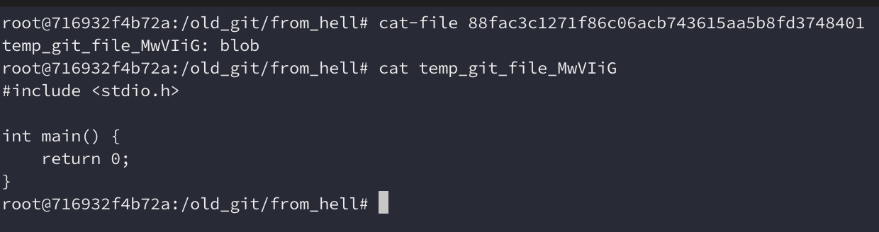 primeira versão é necessário usar cat-file e ele mostra que o objeto é um blob