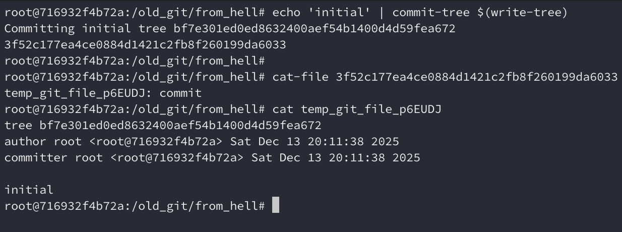 Podemos ver através de cat-file que o commit foi criado com sucesso. Ele é