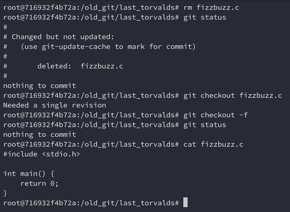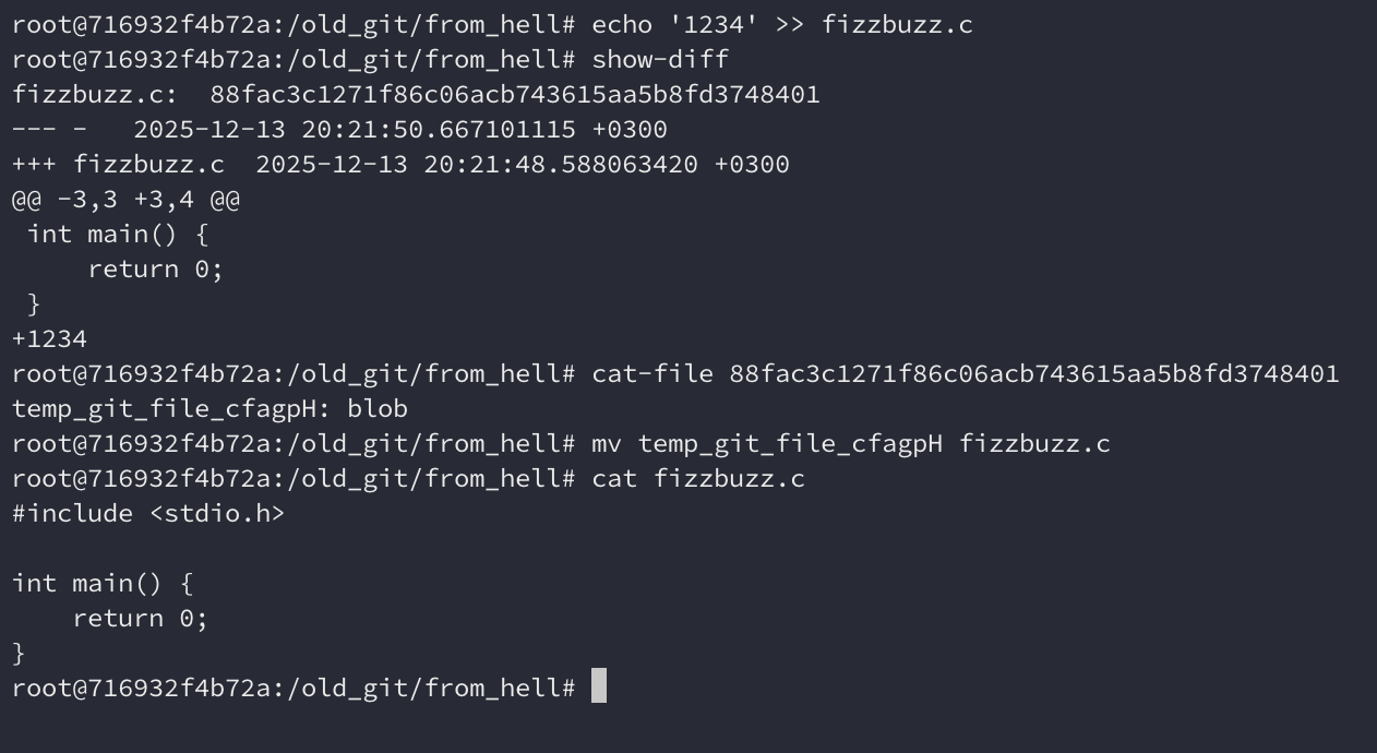 cat-file. Vamos alterar o fizzbuzz.c e tentar restaurá-lo. show-diff nos