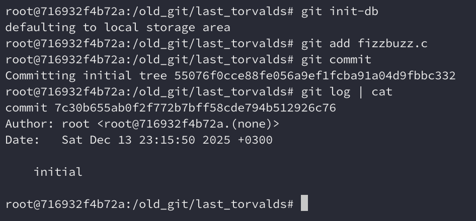 É sempre legal ver o nascimento de algo grandioso. A primeira versão do Git era apenas um conjunto simples de utilitários para manipular alguns arquivos, mas já continha o miolo que torna o Git excelente. A última versão do Git do Torvalds já era muito mais usável e, mesmo que ainda parecesse um tanto frágil, já parecia ser usável o suficiente para ser usada por alguém que realmente sabia o que estava fazendo. Linus certamente sabia e o usou para versionar o Linux.